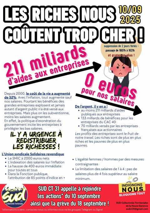La colère qui s’exprime partout autour de l’initiative de 10 septembre, c’est aussi et surtout la nôtre, nous, agent·es des mairies, communautés d’agglo, départements, régions, métropoles, parce que nous sommes les travailleur·ses les plus précaires et plus pauvres du salariat au service de toute la population !