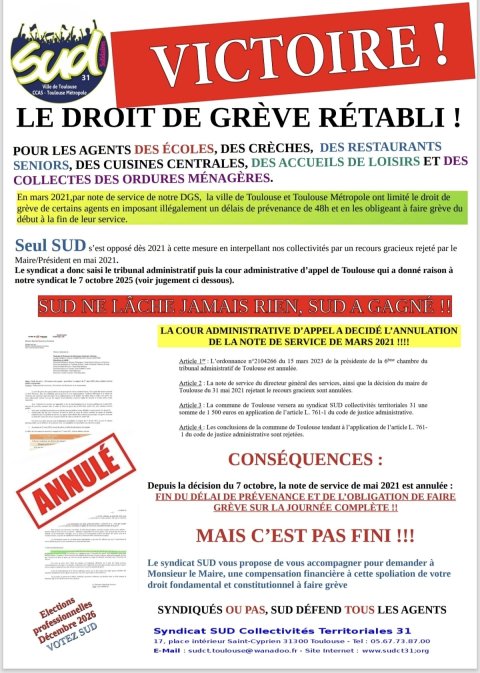 Le 7 octobre 2025, la note de service a été annulée par la cour administrative d’appel !!! victoire de sud et de tous les agents lésés de leur droit fondamental et constitutionnel !!!